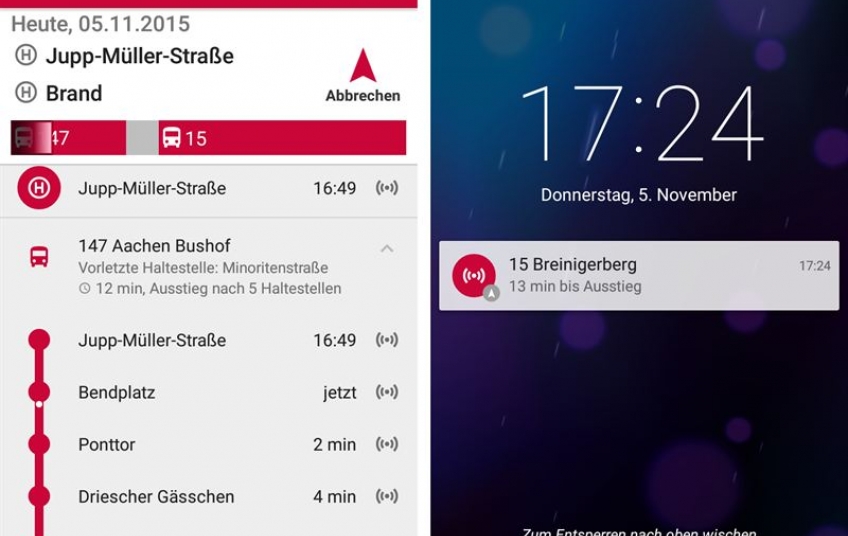 Titelbild: ASEAG Mobil für Android enthält jetzt auch eine virtuelle Fahrtbegleitung mit Benachrichtigungsfunktion. Basis ist die neue Version von IVU.realtime.app von der IVU Traffic Technologies AG (Quelle: IVU)