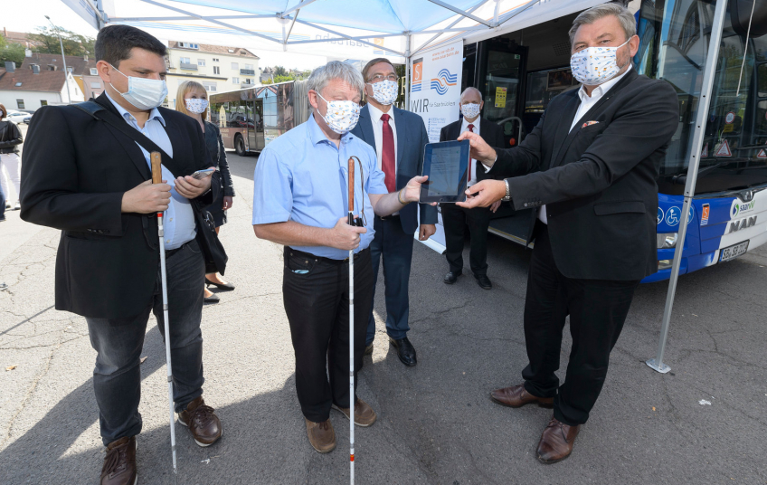 Titelbild: Auftaktveranstaltung des Pilotprojektes am 9.9.2020 am Busbetriebshof der Saarbahn. Vorne von links: Luciano Butera, Leiter Fachstelle Technologie und Innovation des Schweizerischen Blinden- und Sehbehindertenverbandes SBV, Testnutzer Heinz-Peter Engels und Saarbahn-Geschäftsführer Peter Edlinger. (Quelle: Saarbahn / Iris Maurer).